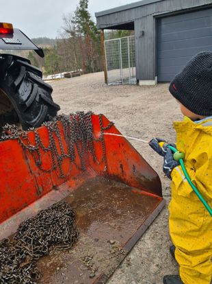 - Når kjettingen er demontert kan den med fordel spyles ren for sand, gjørme, jord m.m