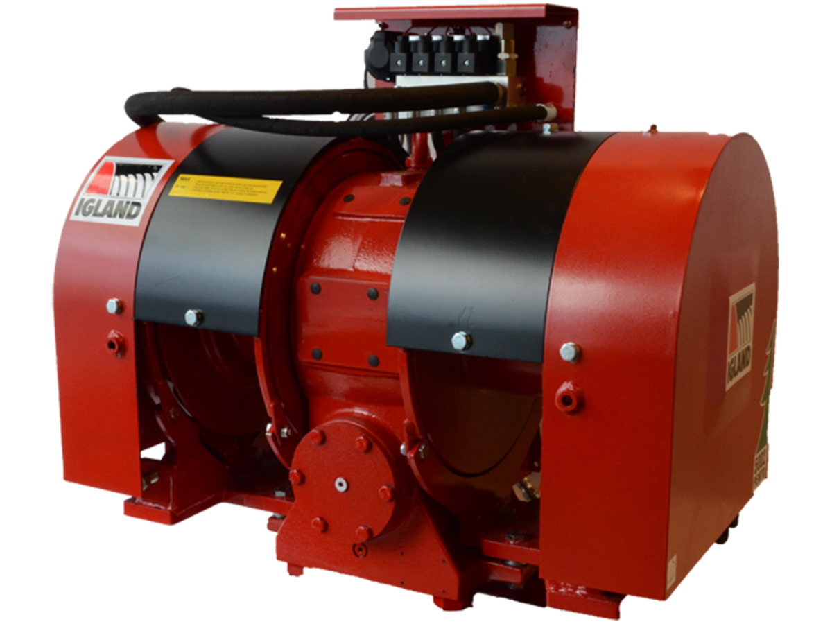 Igland two-drum winches are mostly sold in a TL version which consists of winch head, mounting bracket, and butt plate. They are mounted together in one unit and are adapted to the tractor with a 3-point hitch. In some occasions the customer wants only the winch head and this can be delivered separately on request for permanent mounting on tractors and forestry machines.