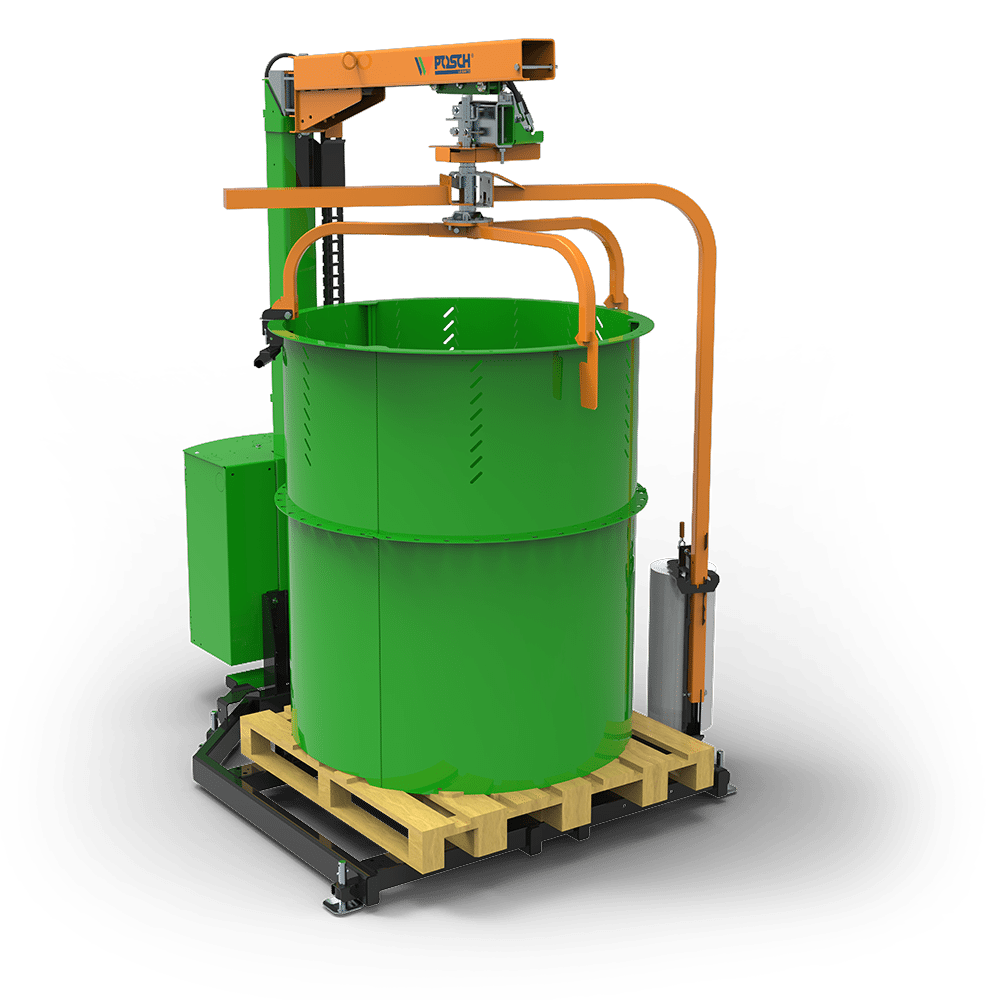 Med PackFix samles de korte vedskiene i trommelen og pakkes inn i et luftgjennomtrengelig nett for optimal tørking. I første trinn festes nettet til pallen, og fylletrommelen med en diameter på 120 cm og en høyde på 145 cm er klar til fylling. Svingarmen løftes, senkes og roteres hydraulisk og kan enkelt styres via betjeningspanelet.